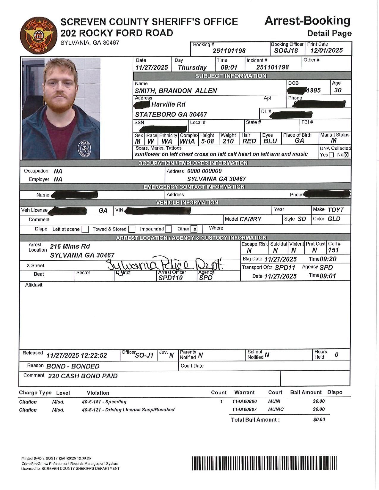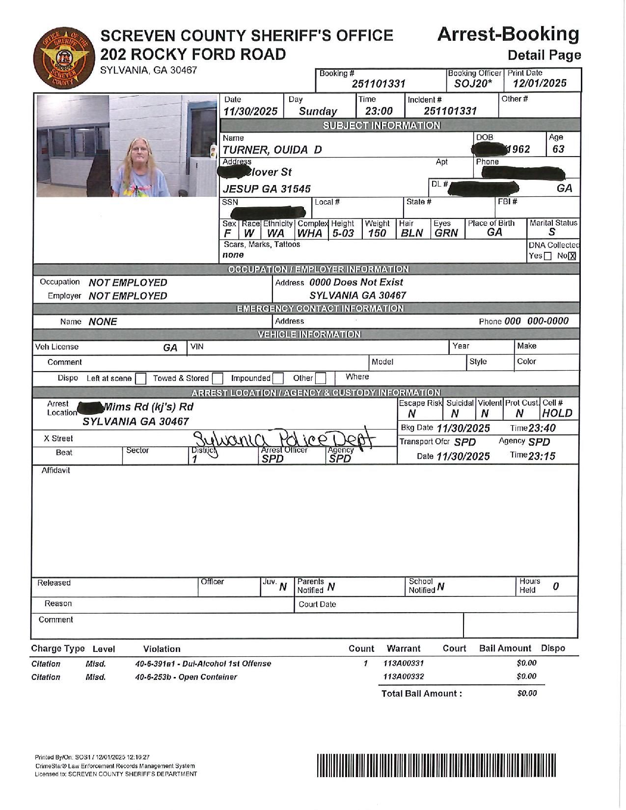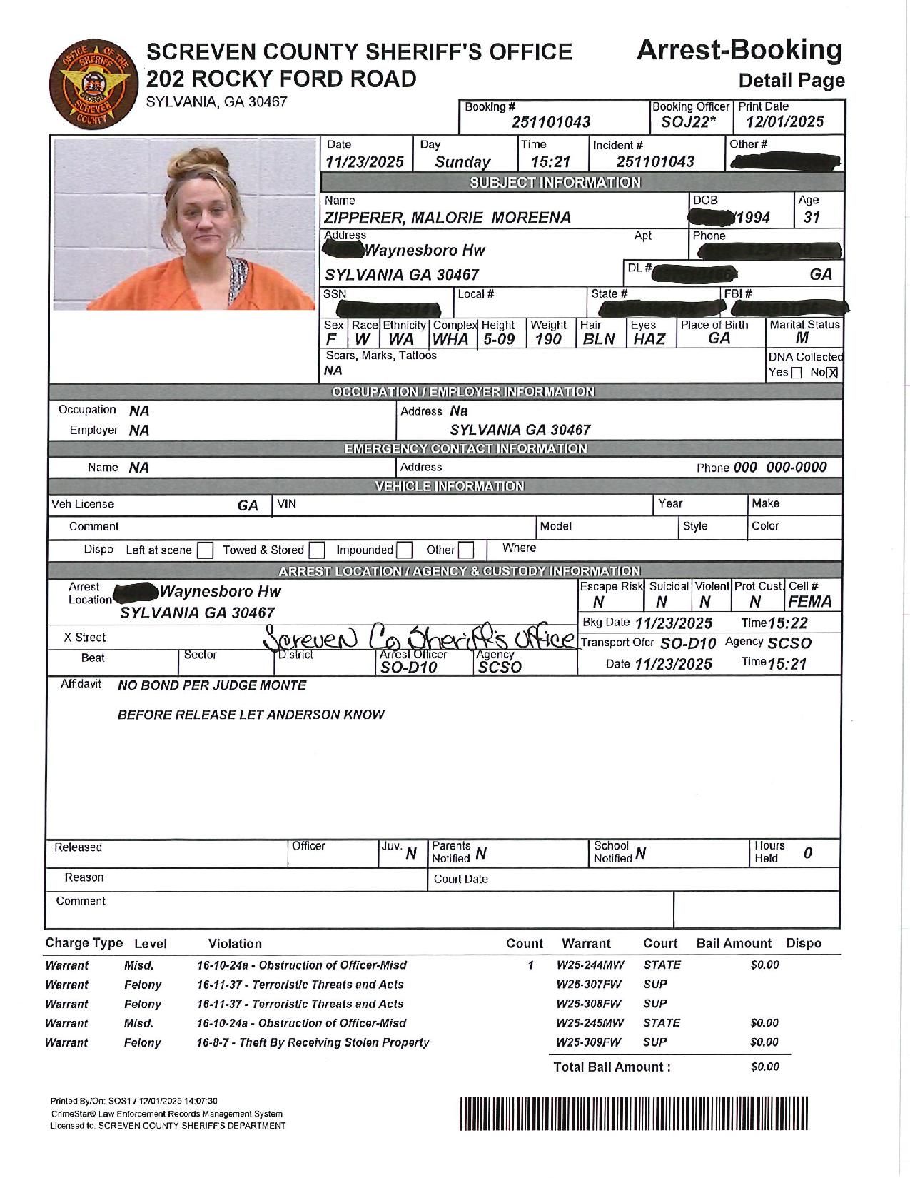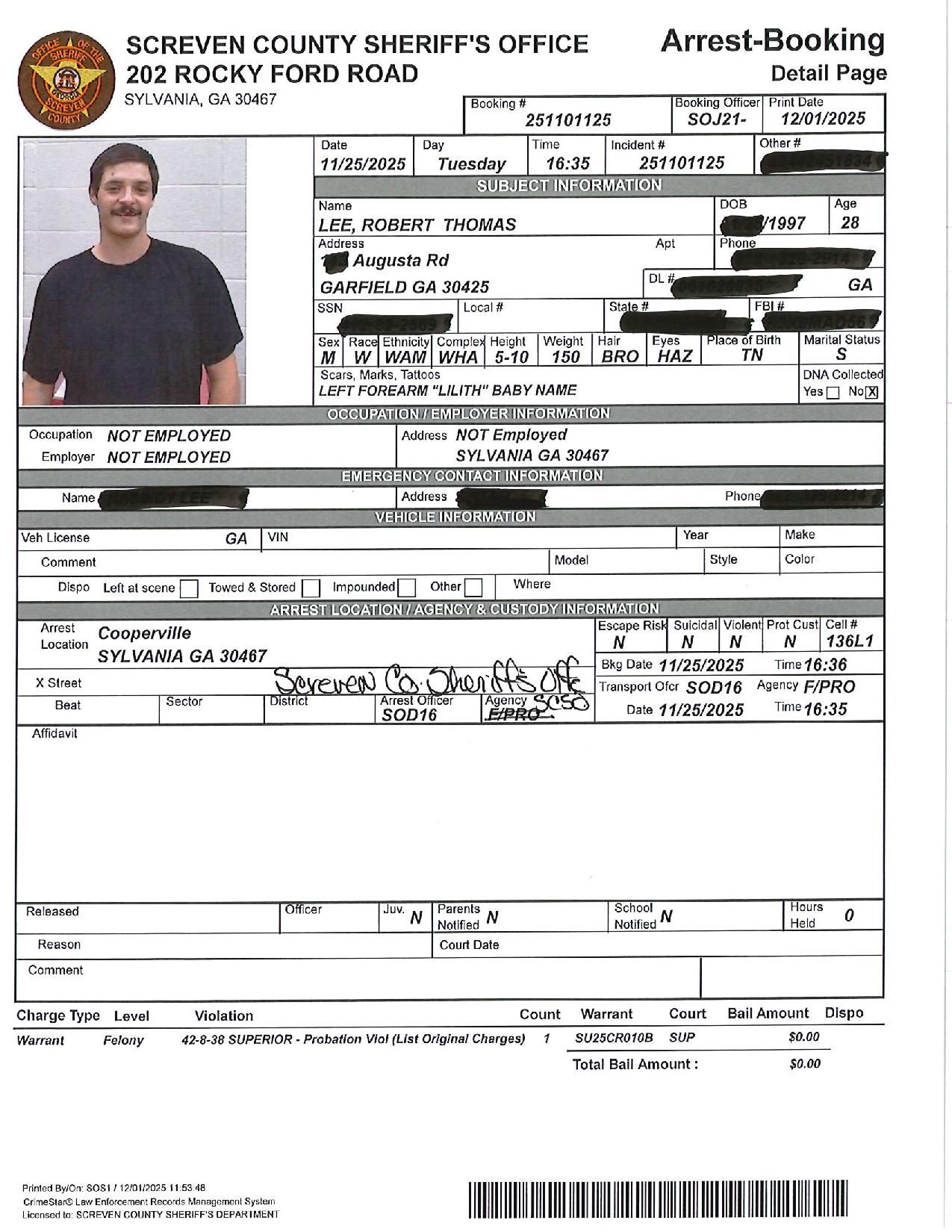 The Screven Co Jail Booking & Incident Report 12/01/25 details arrests from Screven County, area municipalities, the Georgia State Patrol, and any inmates which may be housed for neighboring agencies. Incident reports are from the Sheriff’s Office only.