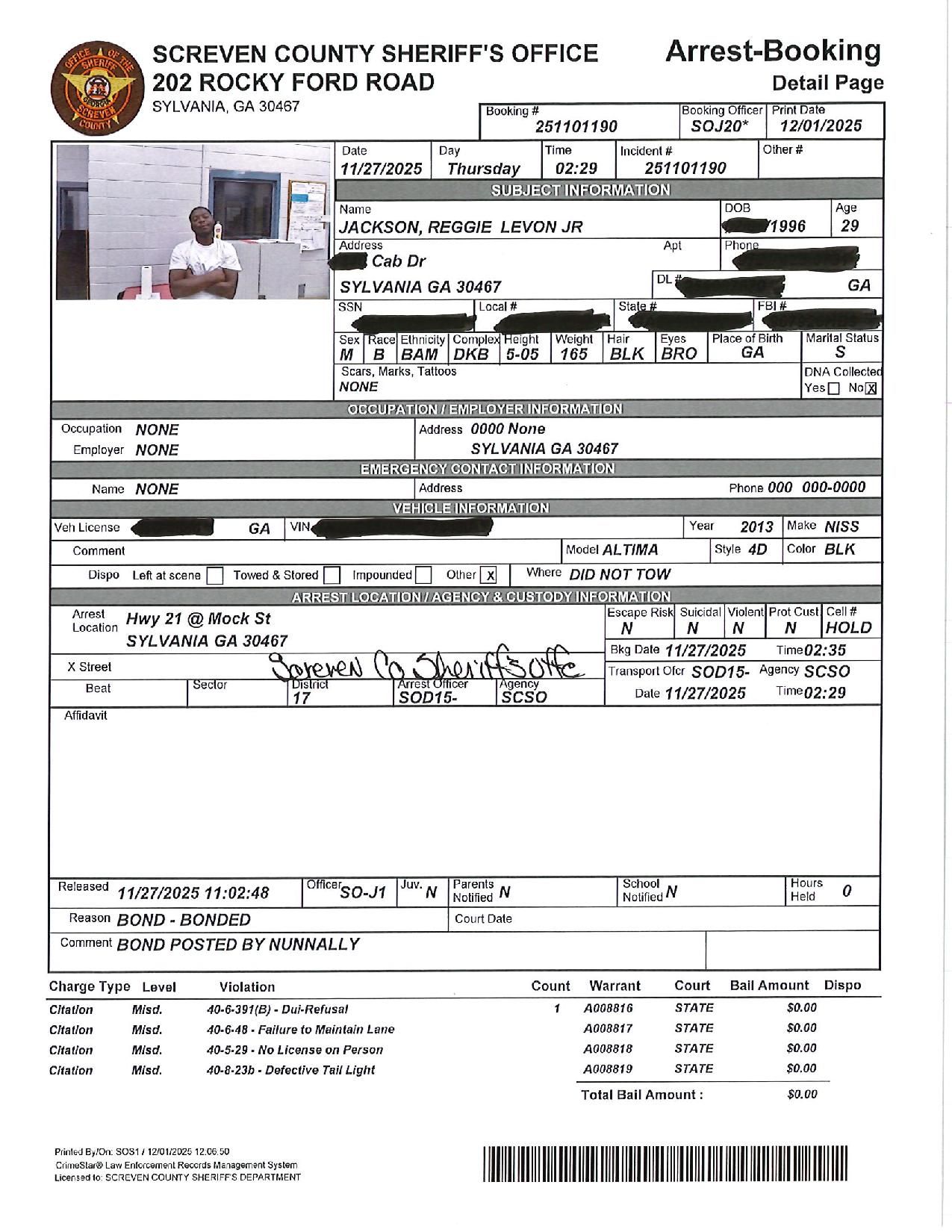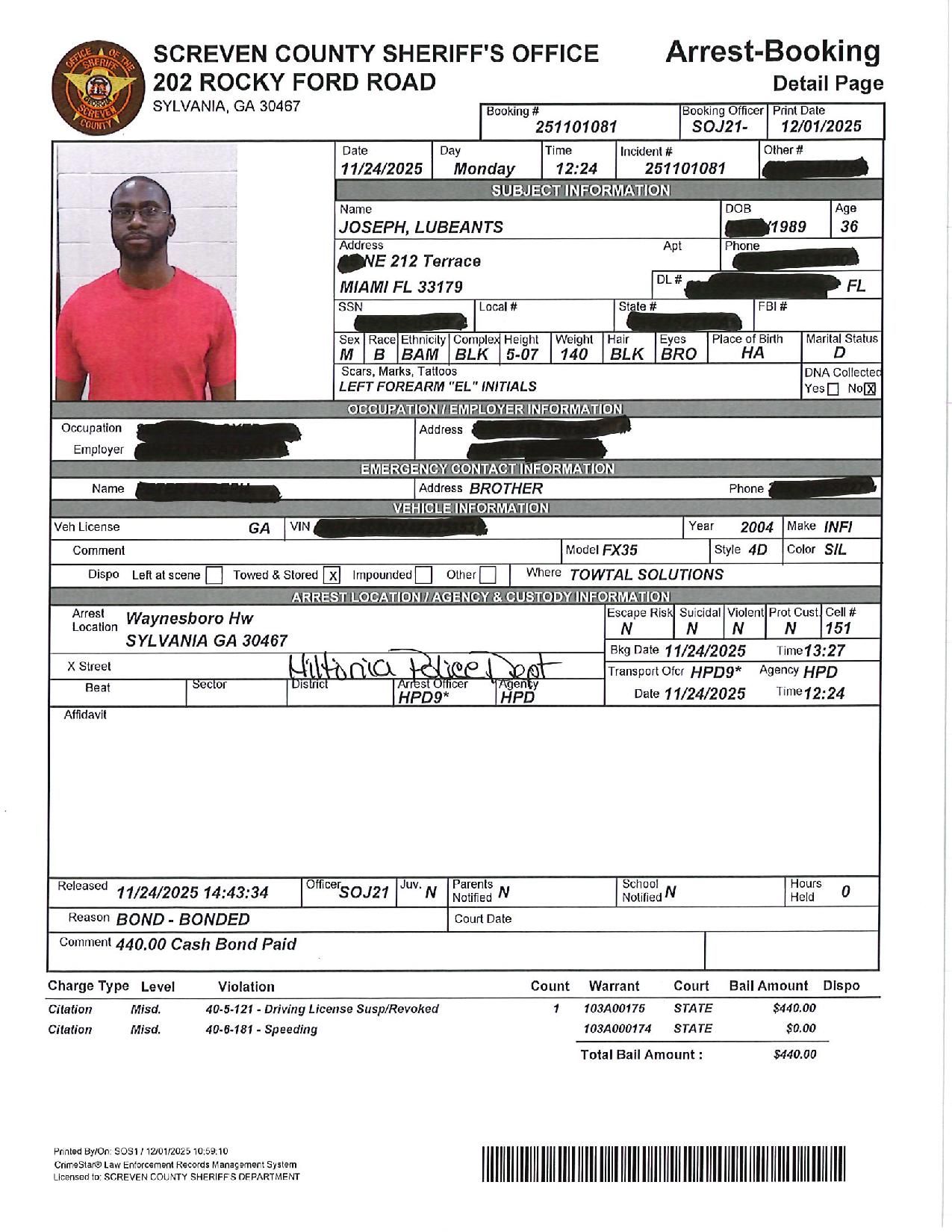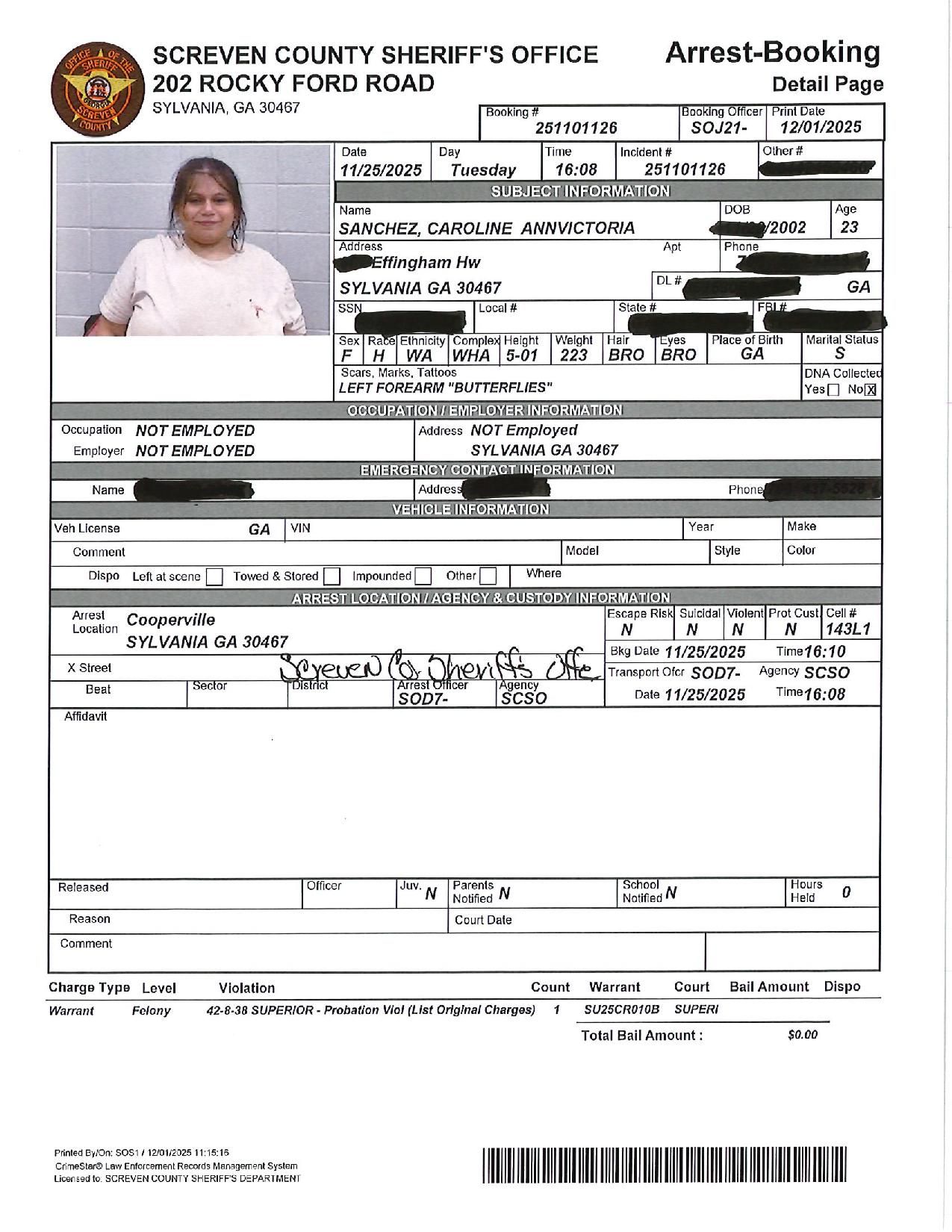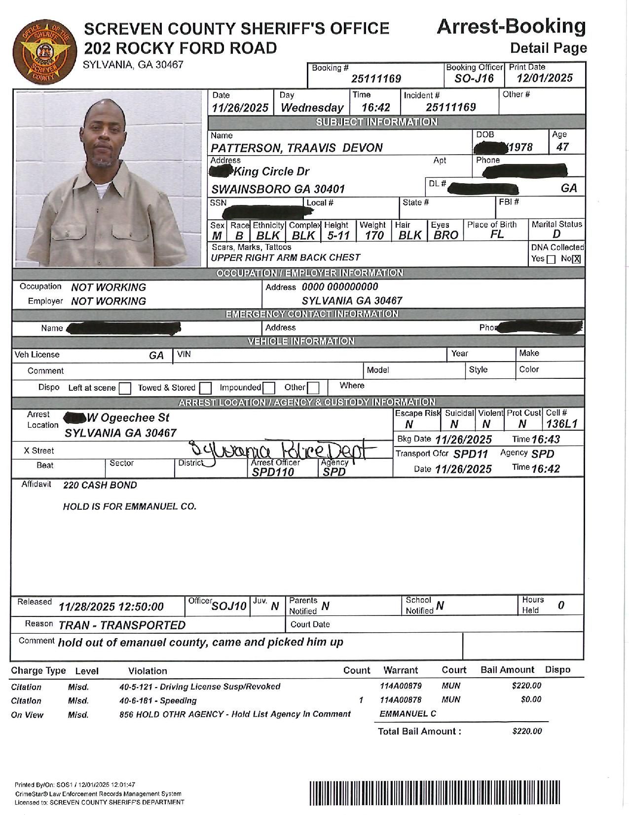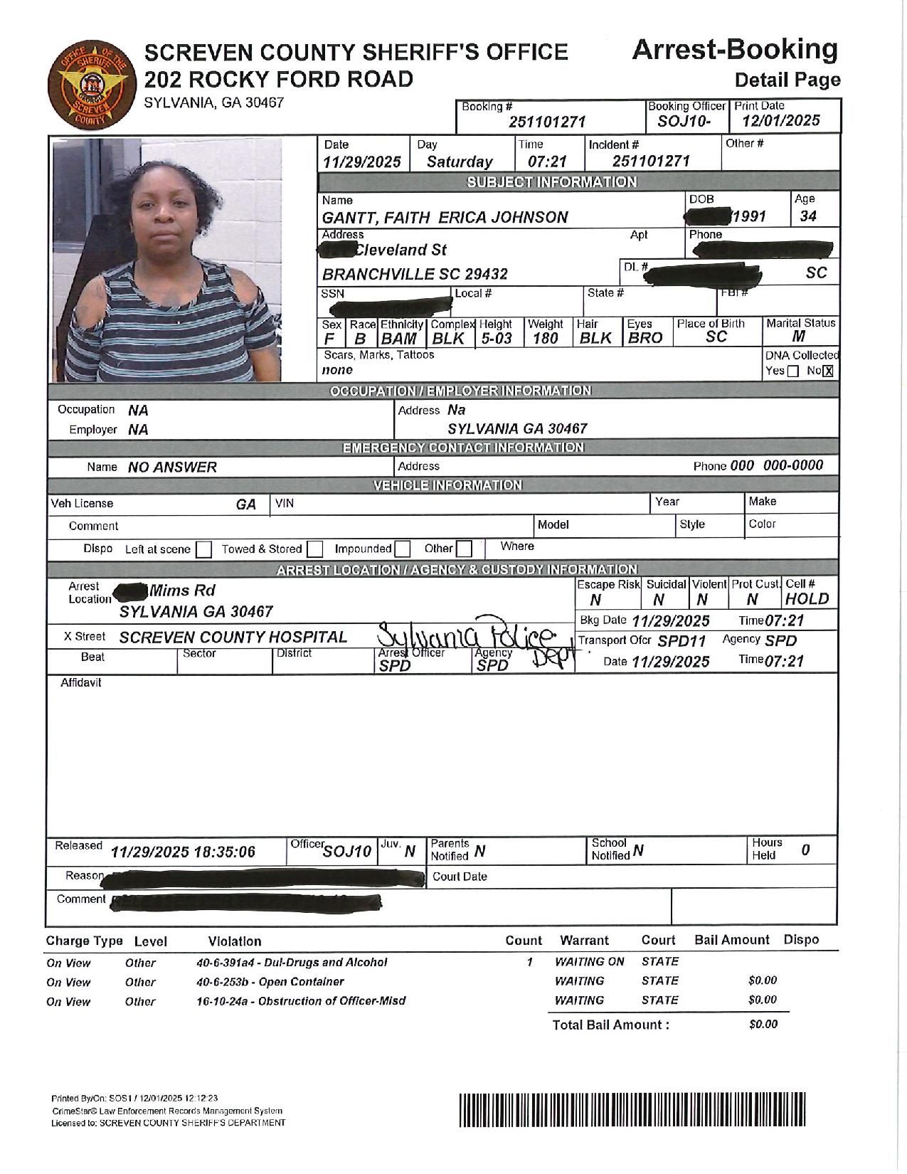 The Screven Co Jail Booking & Incident Report 12/01/25 details arrests from Screven County, area municipalities, the Georgia State Patrol, and any inmates which may be housed for neighboring agencies. Incident reports are from the Sheriff’s Office only.