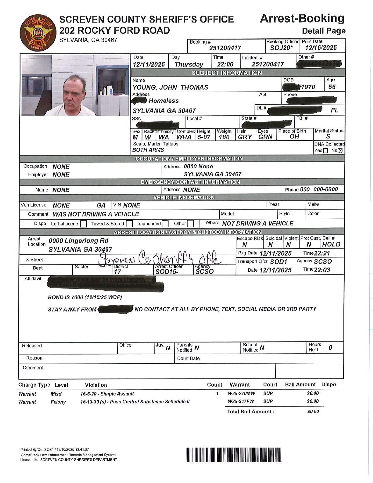 The Screven Co Jail Booking & Incident Report 12/17/25 details arrests from Screven County, area municipalities, the Georgia State Patrol, and any inmates which may be housed for neighboring agencies. Incident reports are from the Sheriff’s Office only.