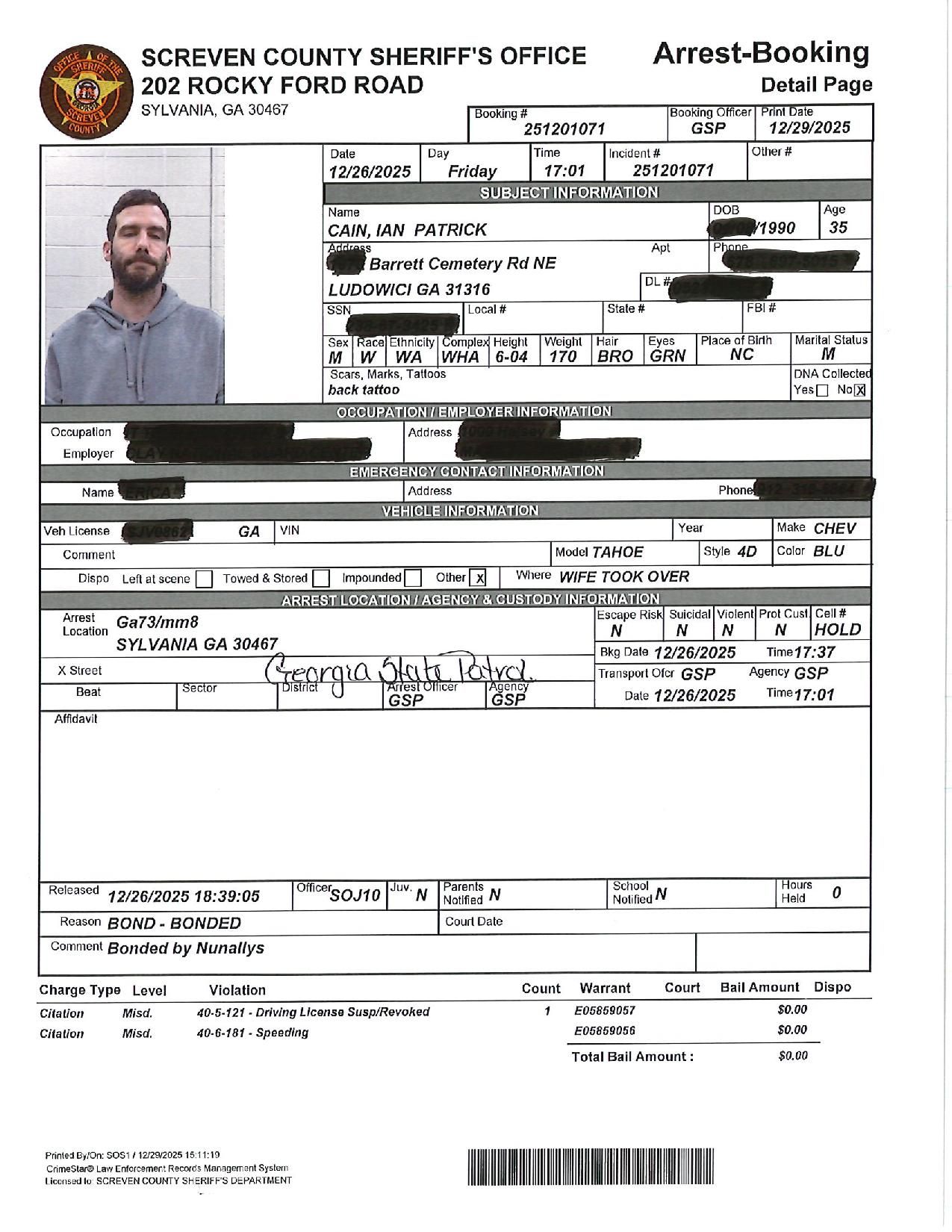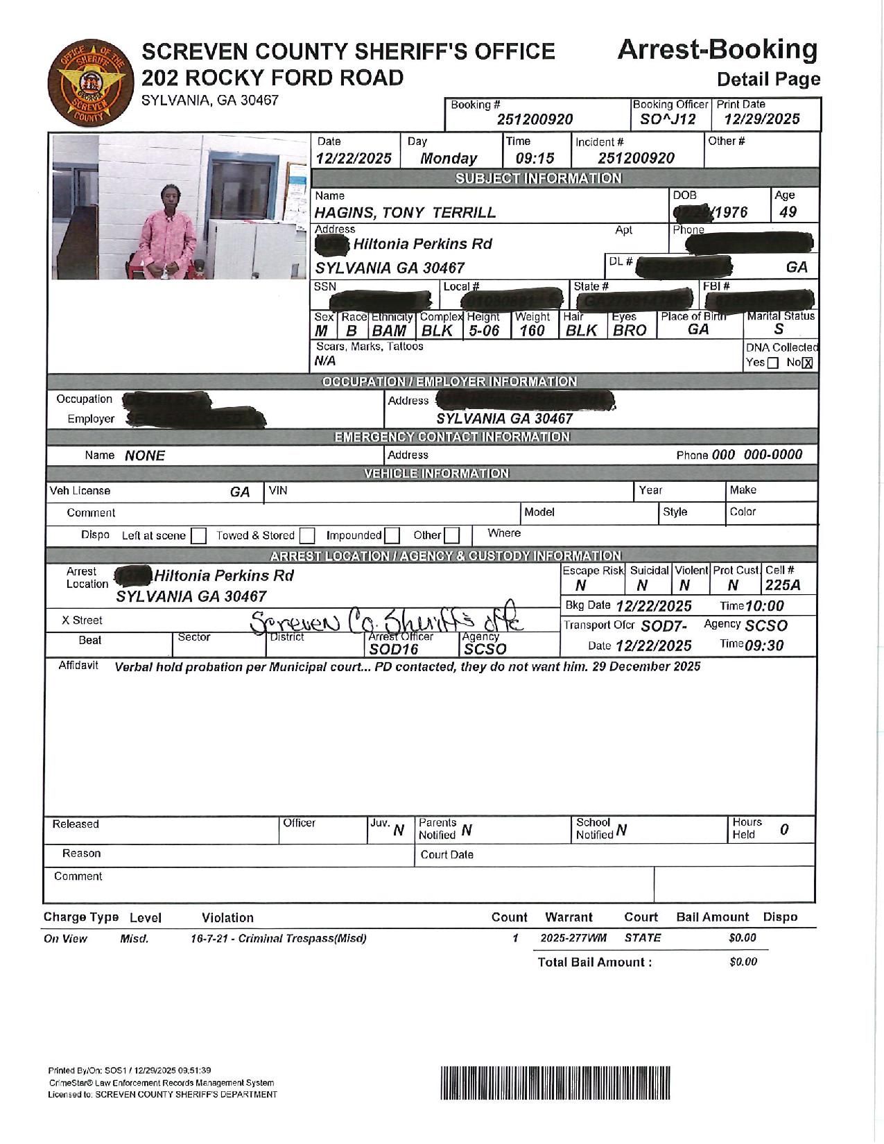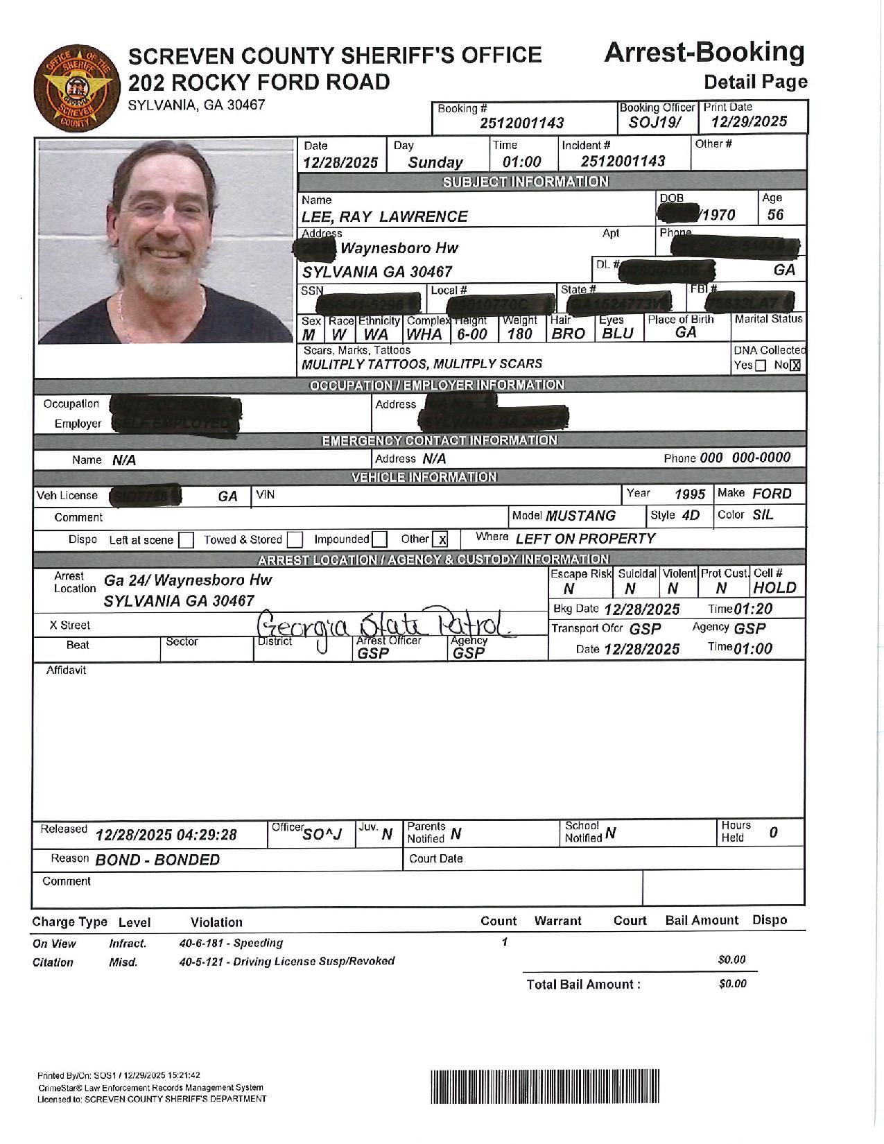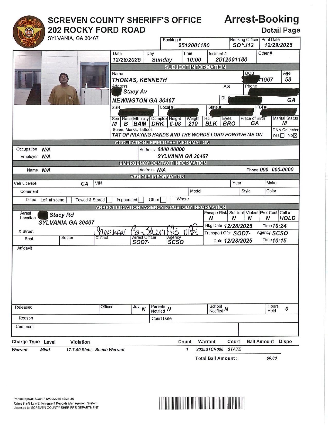 The Screven Co Jail Booking & Incident Report 12/29/25 details arrests from Screven County, area municipalities, the Georgia State Patrol, and any inmates which may be housed for neighboring agencies. Incident reports are from the Sheriff’s Office only.