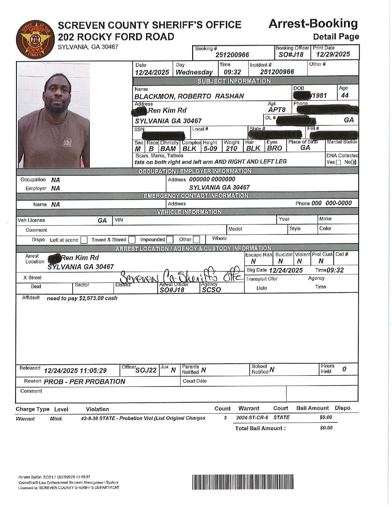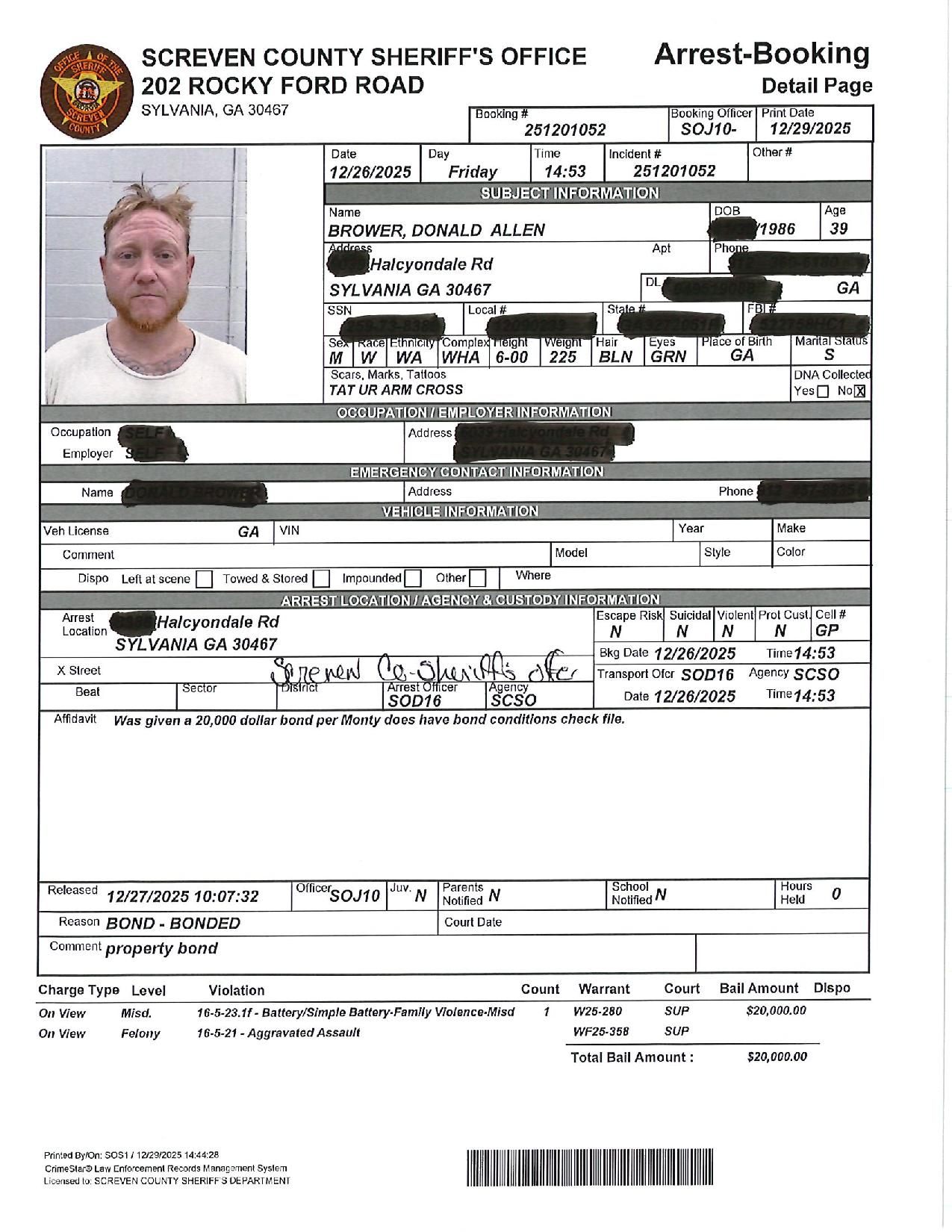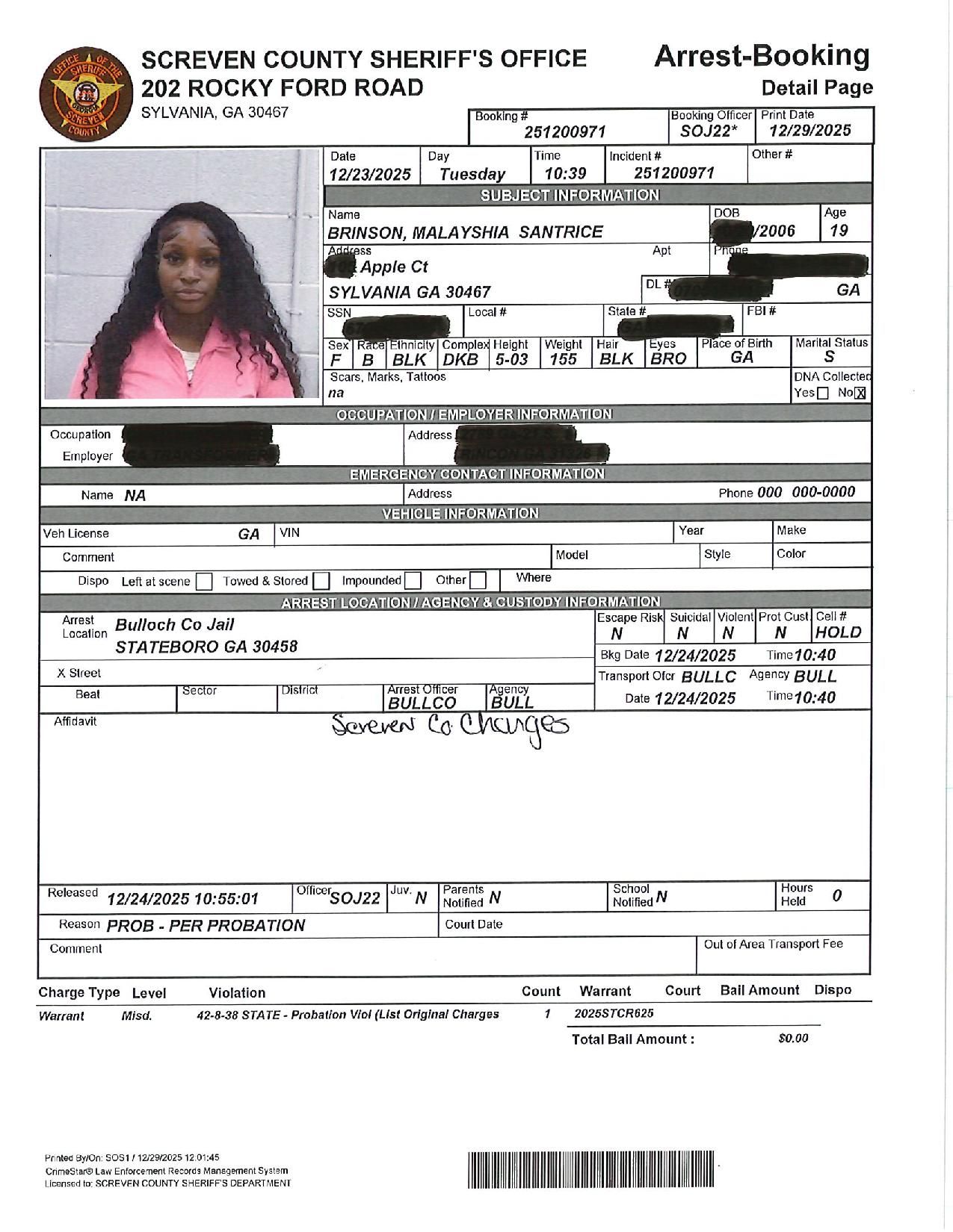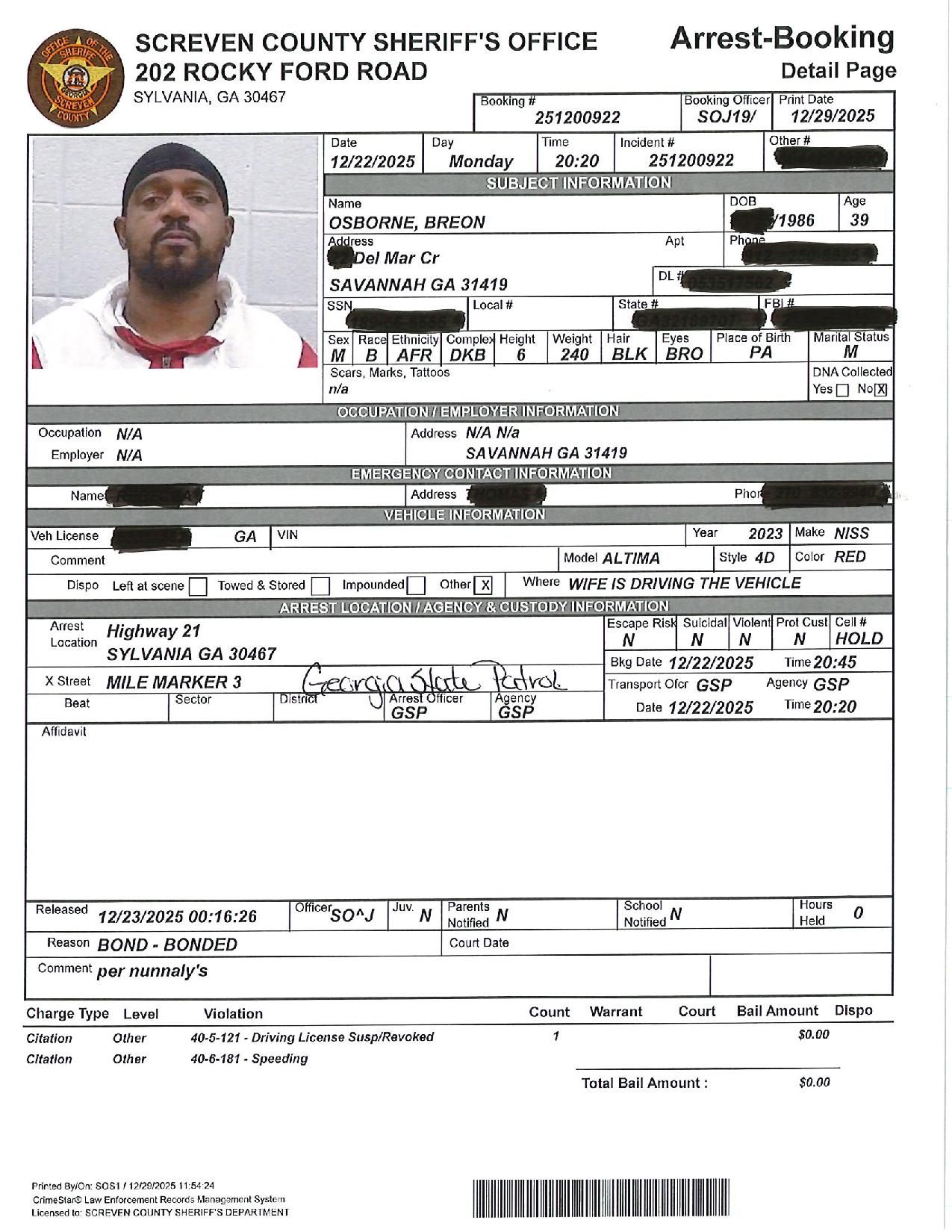 The Screven Co Jail Booking & Incident Report 12/29/25 details arrests from Screven County, area municipalities, the Georgia State Patrol, and any inmates which may be housed for neighboring agencies. Incident reports are from the Sheriff’s Office only.
