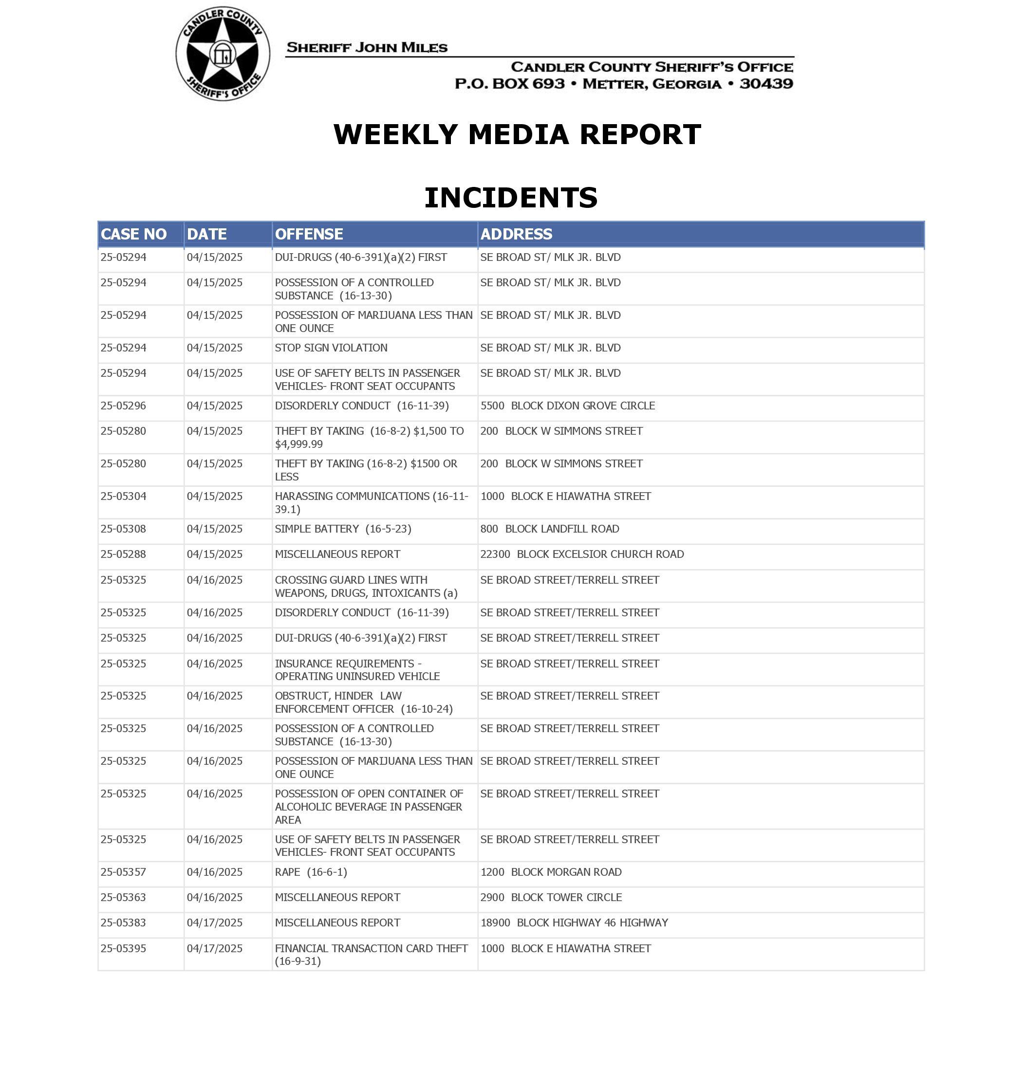 The Candler Co Jail Booking & Incident Report 04/21/25 details arrests from Metter, Candler County, and the Georgia State Patrol. Incident reports are from the Sheriff’s Office only.