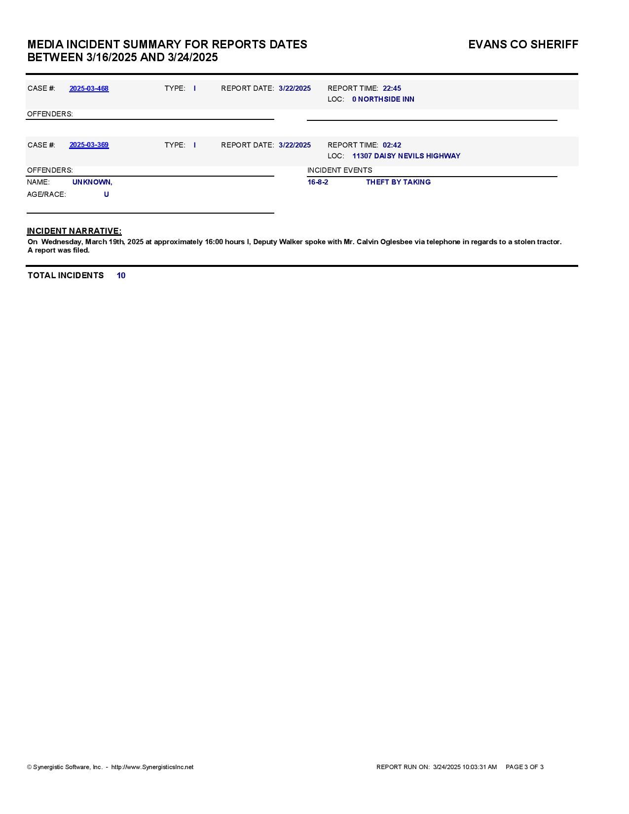 The Evans Co Jail Booking & Incident Report 03/24/25 details arrests from Evans Co., Claxton, Bellville, Hagan, and the Georgia State Patrol. Incident reports are from the Sheriff’s Office only.