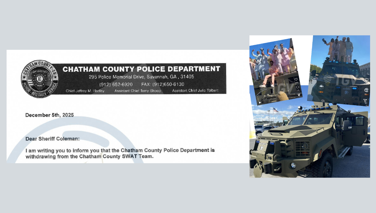 The story was reported exclusively by TheGeorgiaVirtue.com in late November. At the time, TGV reported that a Savannah area family was permitted to utilize a $275,000 Bear-Cat armored vehicle for a wedding event in Chatham County. Photos and videos appeared on social media with members of the family and wedding party atop of the vehicle while music played and bubble guns filled the skies.
