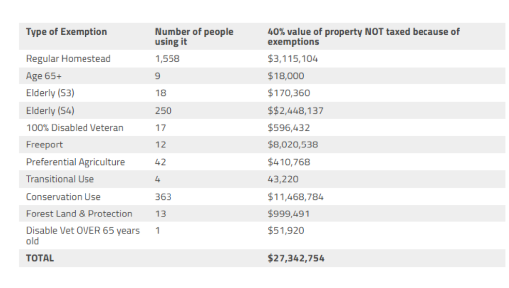Due to homestead exemptions already in place, the school board already foregoes $393,708.31 annually – mostly due to conservation exemptions, agriculture stipulations, and homestead exemptions per the state. This $393,708.31 is just over the 10% threshold of what the county does collect.