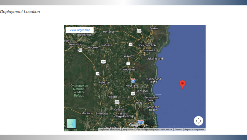 CRD staff oversaw the deployment on Friday, Jan. 23, 2026. Due to the reef’s proximity to naval training areas associated with Kings Bay Naval Submarine Base, the project required additional coordination to ensure the deployment was conducted safely and in compliance with all federal and state requirements.