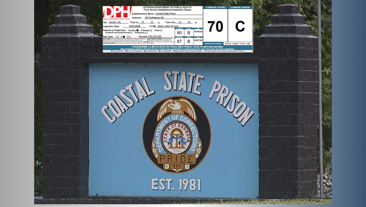 Officials with the Georgia Department of Public Health visited Coastal State Prison in Chatham County on April 23 to evaluate the facility, which has been on a steady decline for health scores since at least February 2025. In October, the facility scored an 80 and in February 2025, the facility received an 87.